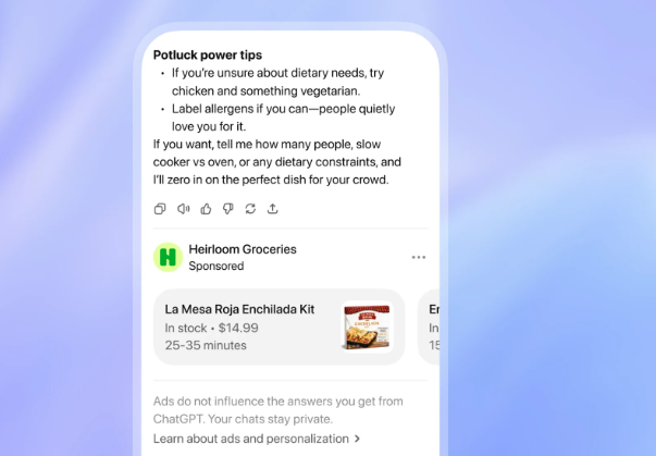 Ads are matched to conversation topics and past usage, but users stay in control. You can dismiss ads, turn personalization off, or trade fewer ads for fewer messages or a paid plan.