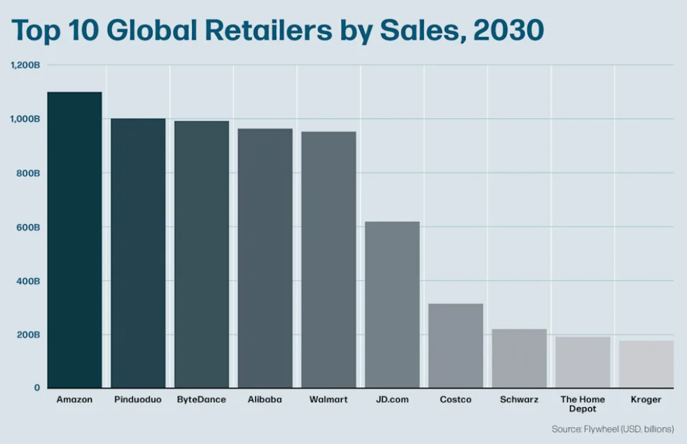 1) A Trillion-Dollar Trajectory, Walmart at Risk - Flywheel projects TikTok Shop could capture 14.6% of global marketplace share and approach $1 trillion in sales by 2030, potentially overtaking Walmart, which may fall to 5th as the only top player still heavily store-based.