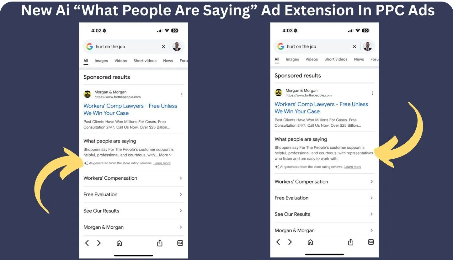 3. New AI Asset - Google is testing a “What People Are Saying” automated asset that generates sentiment-style summaries not directly sourced from advertiser content, raising questions about accuracy and brand control as Google continues inserting AI-written supporting text into ads.