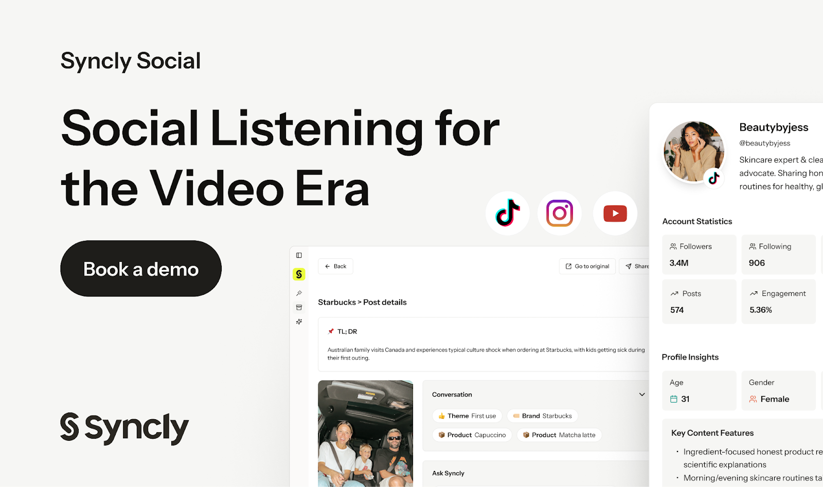 - True video listening: See every brand moment on TikTok, IG, and YouTube, tagged or not.