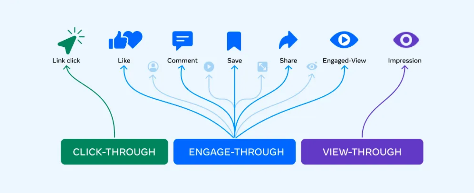 Social Actions Move to Engage-Through Attribution: Saves, shares, and other non-click interactions move into a renamed category called “engage-through attribution.” Meta wants advertisers to use this to measure the full value of social engagement separately.