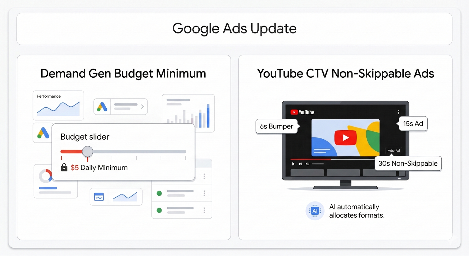 Two Google Ads updates worth knowing. Demand Gen campaigns now have a minimum spend requirement, and non-skippable YouTube CTV ads are live globally with AI-managed format delivery.