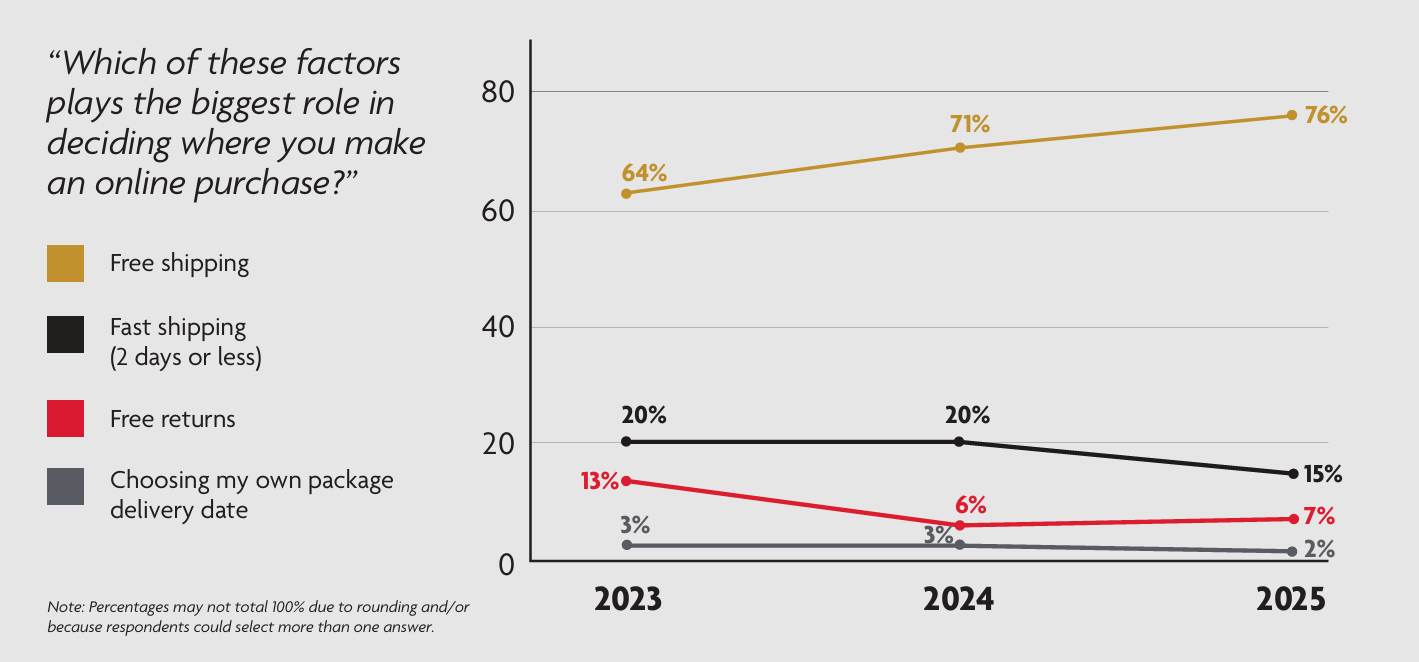1. Speed Over Price 62% of consumers say fast, reliable shipping outweighs price, and two-thirds would give up a 5% discount for guaranteed delivery. Expectations for 2–3 day shipping climbed to 30%, while tolerance for week-long waits dropped to 23%.